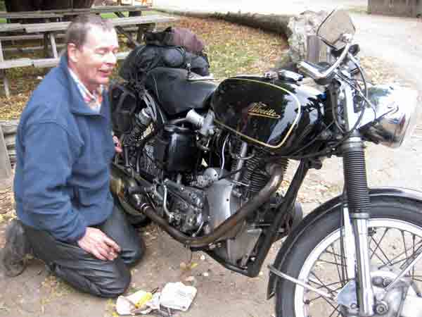After removing my helmet and saddlebags from my Buell, I jumped on the back of the nearby Velocette Endurance. Fred Mork with his Velocette Venom is in the background.