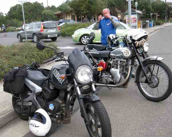On Saturday morning, Fred, Jeff and I rode to Novato where over a hundred British motorcycles were gathering. Here I ditched my JezeBuell, we drank coffee and greeted old friends. Although predominately a BSA ride, all sorts of British bikes were present. Ariels, Greeves, Matchless, Nortons, a Panther, Triumphs, Velocettes and Vincents had also been prepped for this ride.